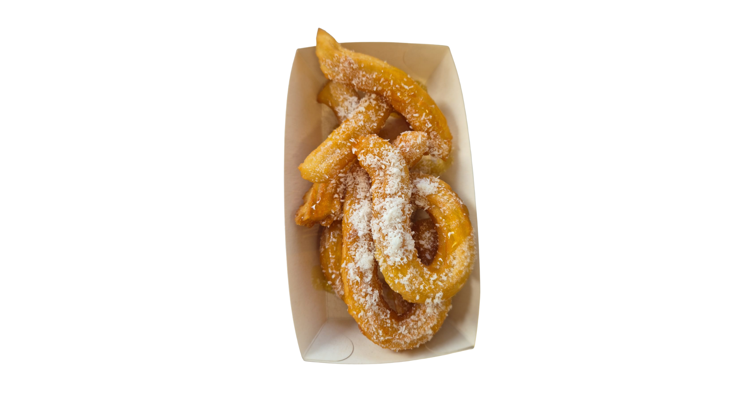 Frisch gebackene Churros, begleitet von exotischem Mango-Püree und bestreut mit feinen Kokosraspeln. Ein fruchtig-cremiger Genuss, der dich direkt in die Karibik entführt.
